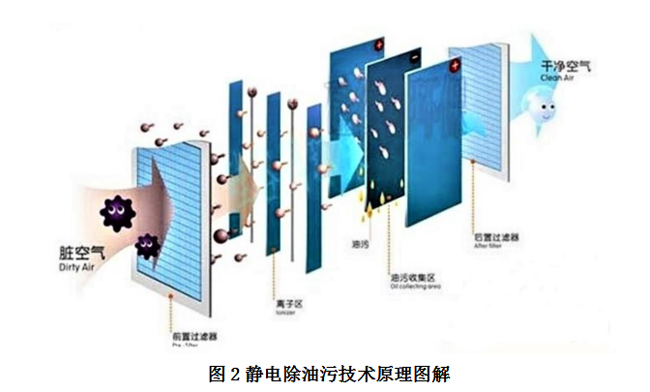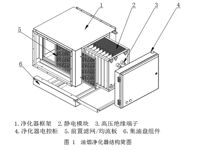 該油煙凈化器為二級式靜電吸附型,用來去除細微粒徑的碳氧化合物盒其他空氣中的雜粒。二級式是指靜電模塊分為電離區和集塵區,電離區由多根鎢鋼絲或尖刺極板組成,安裝在接地板中間,并通入高壓直流電。大氣中的微粒在通過電離區的強力靜電場時,被電離并帶有正或負電荷。集塵區則由大量平行板組成,通入低壓直流電(極性同電離區致,但電壓減半)以形成電場,帶電微粒被帶點極板排斥同時被接地極板吸引。如此,空氣中的雜質顆粒會被有效去除。